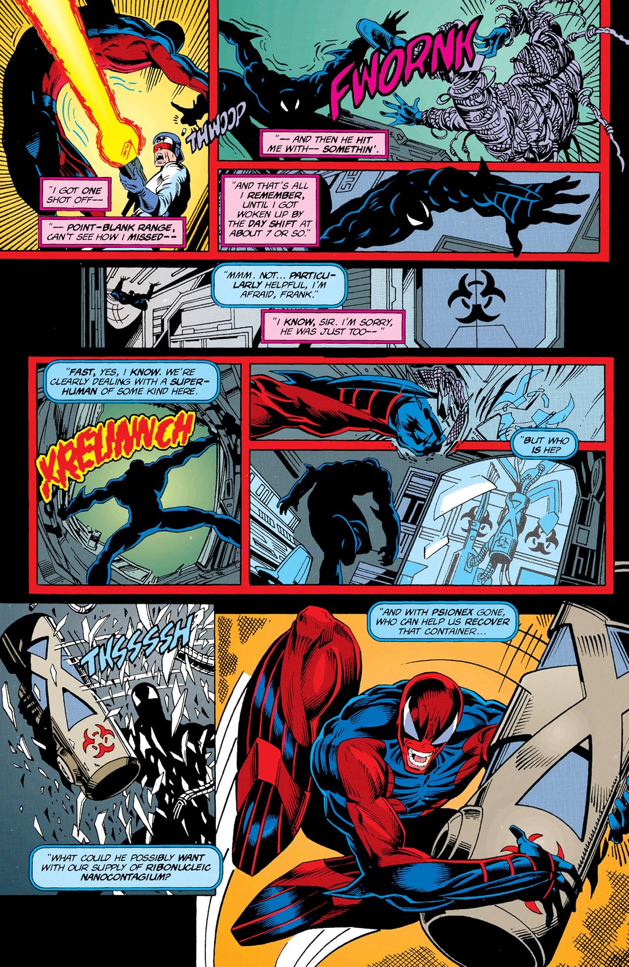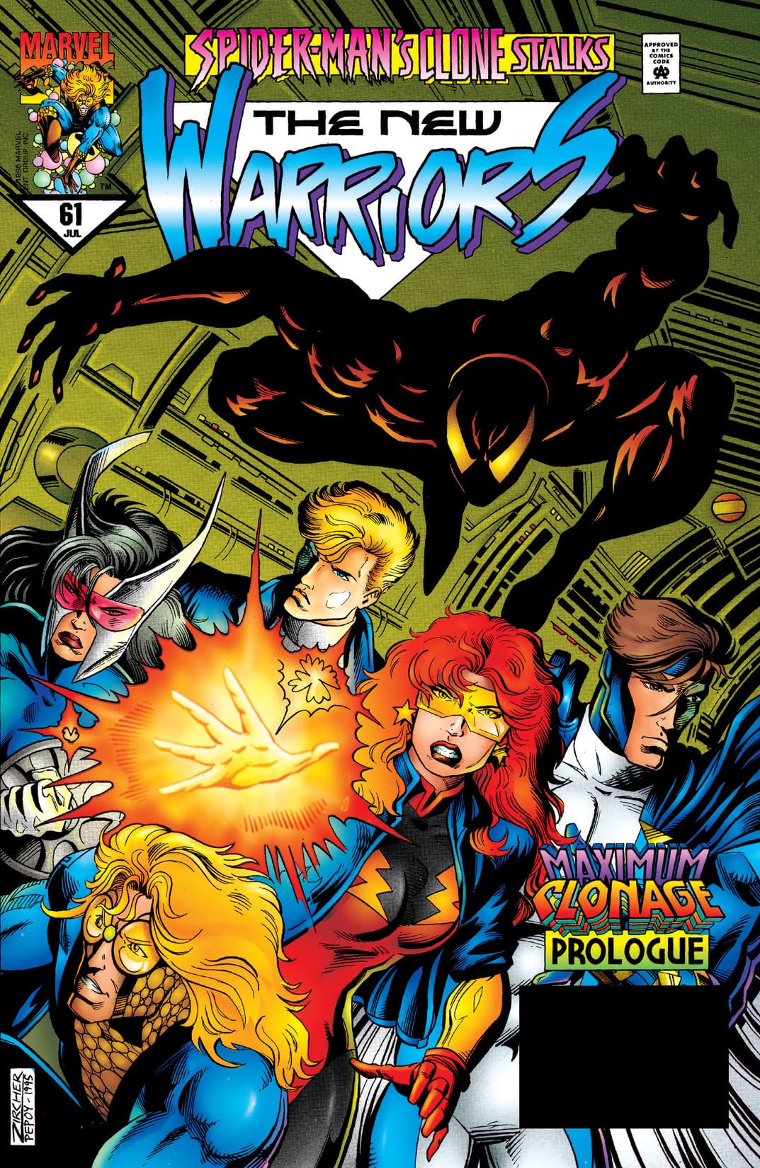 Właściwie fabuła interesując mnie w tym konkretnym zeszycie ze względu na łączność z Sagą Klonów, jest… marna. Ot Spidercide wykrada pierwiastek potrzebny do planów Jackala i tyle. Śledztwo w tej sprawie prowadzą New Warriors, którzy oczywiście mają swoje plany. Nova bez mocy, Angel używająca swoich mocy na gwałcicielu znajomej (żenująca przy tym jest rozmowa czy jej mikrofale nie są szkodliwe i nie wywołają raka albo bezpłodności – amerykańska paranoja z mikrofalówkami nawet w połowie lat 90 jak widać miała się świetnie), Speedball nie kontrolujący do końca swym mocy itd. itd. … I choć są ciekawe rzeczy (pytanie o wpływ mocy na innych rodzi inne – jak te moce wpływają na zdrowie ich posiadacz), kilka niezłych retardacji (tajemnicza kobieta znająca tożsamość Sppeedballa i wiele innych rzeczy), tak naprawdę nie ma tu nic, co byłoby warte czy godne czytania.