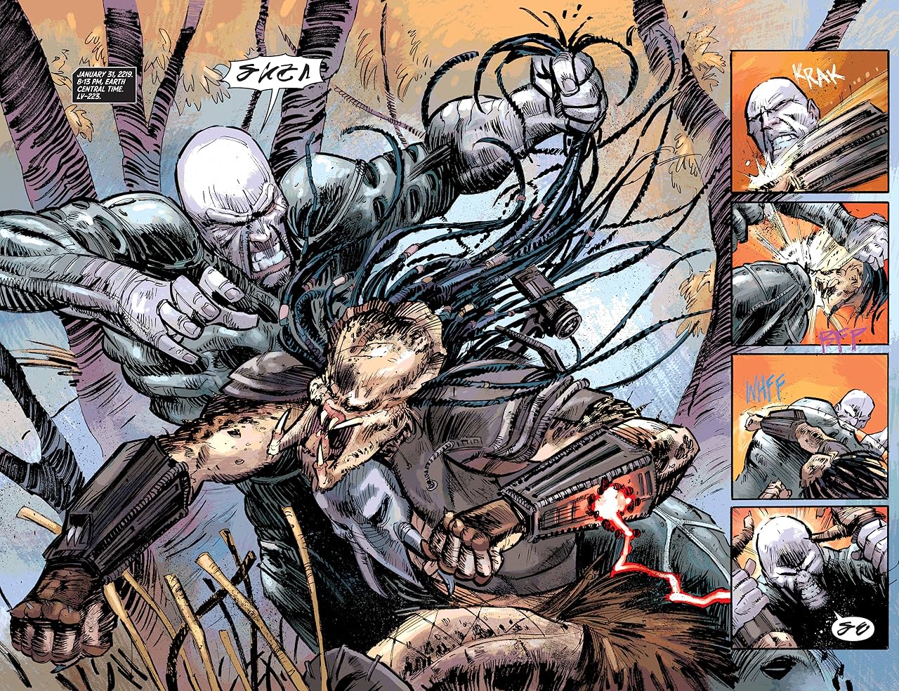 I tu na scenę wkracza Chris Mooneyham, ilustrator operujący brudną kreską, który tworzy naprawdę ciekawy klimat. „Predator” w jego wykonaniu nie przypomina hiperrealistycznej oprawy graficznej „AVP”, ale prostota rysunków i ich klasyczna forma (przypominająca nieco ilustracje z „AVP: Dreszcz polowania”, jednak o wiele od nich lepsza) dobrze pasują do całości. Zresztą Mooneyham zna to uniwersum dość dobrze, przez laty współtworzył bowiem „Predator Vs. Judge Dredd Vs. Aliens”, i równie dobrze w nim się odnajduje.